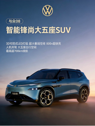 2026年3月26日,大众汽车(安徽)全新智能锋尚大五座SUV——与众08正式开启全国预售,预售价区间为23.99万元至29.99万元。